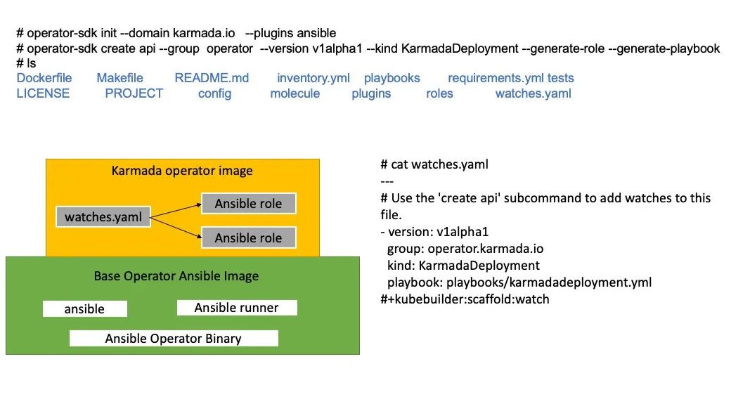 这里主要定义KarmadaDeployment、EtcdBackup和EtcdRestore个资源,分别用于Karmada的部署,和etcd的数据备份和恢复。ansible Operator会根据spec里定义解析成ansible的vars。status将通过 ansible runner 输出为用户自定义的状态。也可以通过ansible的k8s_status更新KarmadaDeployment的状态。当前主要考虑的是在K8s运行Karmada,后面会添加二进制部署模式,当前的CR没有涉及。
