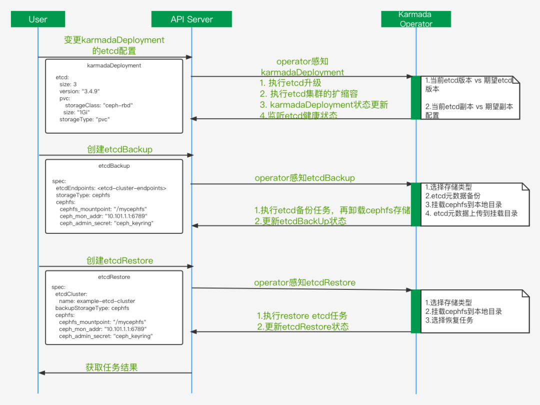 添加member到存在的etcd集群。etcd集群删除member。etcd集群的备份,比如支持cephfs的数据备份。etcd集群故障恢复。etcd集群健康状态查询。这里定义了etcdBackup和etcdRestore的CR,没有合并到KarmadaDeployment里。主要考虑到etcd集群本身操作的安全性和简化KarmadaDeployment的ansible任务。其中etcdRestore功能,可以根据etcd集群备份数据,实现导入到新的etcd集群,从而恢复Karmada集群所有的业务状态。当前主要场景如下: