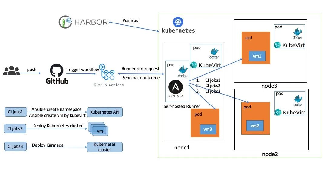 为了更好的提高开发人员的体验,计划提供Karmada-Operator的CI构建能力。这里在K8s集群里部署github的self-hosted Runner和kubevirt。