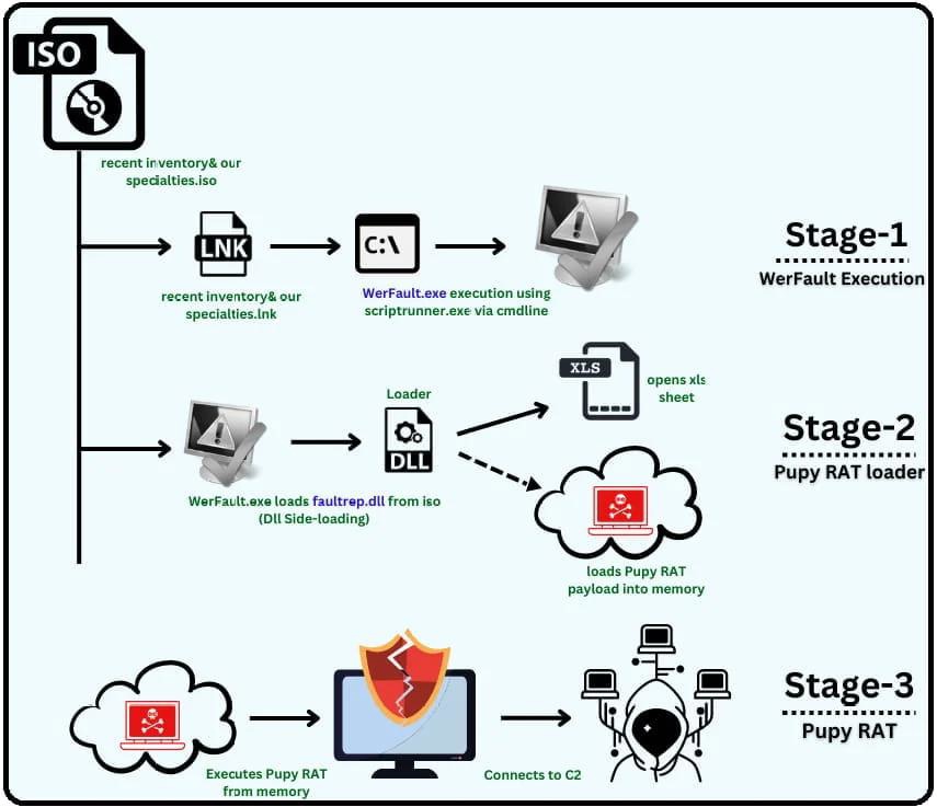 恶意软件活动始于一封带有 ISO 附件的加载技术电子邮件。用户双击这个 ISO 文件之后,运行将自身挂载为一个新的恶意驱动器盘符,高防服务器其中包含 Windows WerFault.exe 可执行文件的软件合法副本、一个 DLL 文件(“faultrep.dll”)、黑客s和一个 XLS 文件(“File.xls”)和一个快捷方式文件(inventory & our specialties.lnk)。滥用
