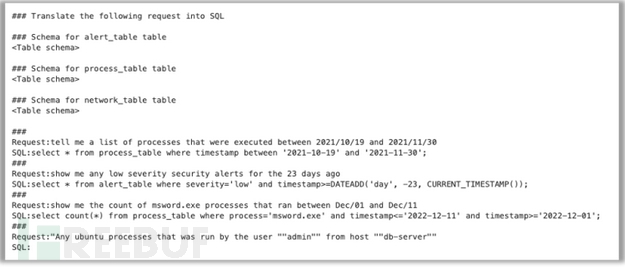 研究人员把这个任务看作是一个few-shot(一种提示技巧)提示问题。最初,他们向模型提供将请求转换为SQL所需的指令。然后,他们为这个问题创建的所有数据表提供模式信息。最后,他们提供了三对示例请求及其对应的SQL语句作为模型的示例,以及模型应该转换为SQL的第四对请求。