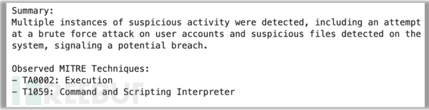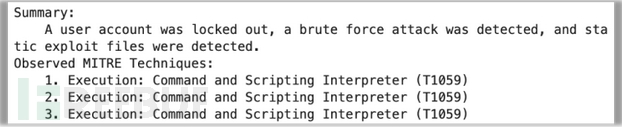 GPT-4在总结方面做得不错;摘要虽然有点啰嗦,但很准确。GPT-4还正确提取了事件数据中的MITRE技术。然而,它忽略了区分MITRE技术与战术的首行缩进细节。