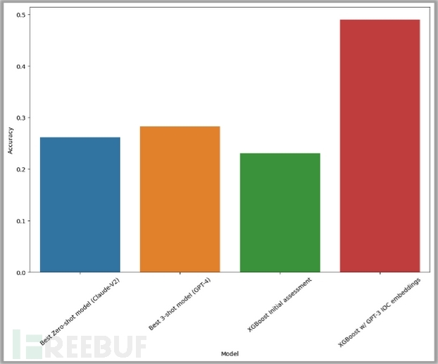 此外,研究人员还尝试将GPT-3生成的嵌入应用于警报数据(用红色条表示)。结果观察到其性能显著提高,准确率达到50%。