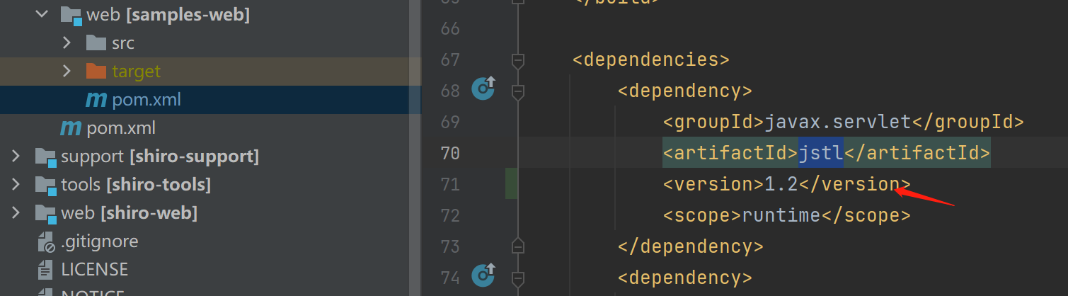 复制git clone https://github.com/apache/shiro.git git checkout shiro-root-1.2.4 //切换到1.2.4版本1.2.打开后需要修改shiro/samples/web/pom.xml路径下jstl的依赖版本,否则会出现jsp解析报错。