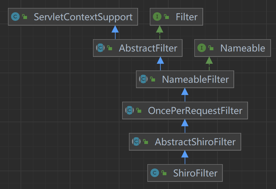 ShiroFilter是Filter的子类,由于它的匹配规则是/*,所以所有的请求都会被他处理。先来看一下它的继承关系。
