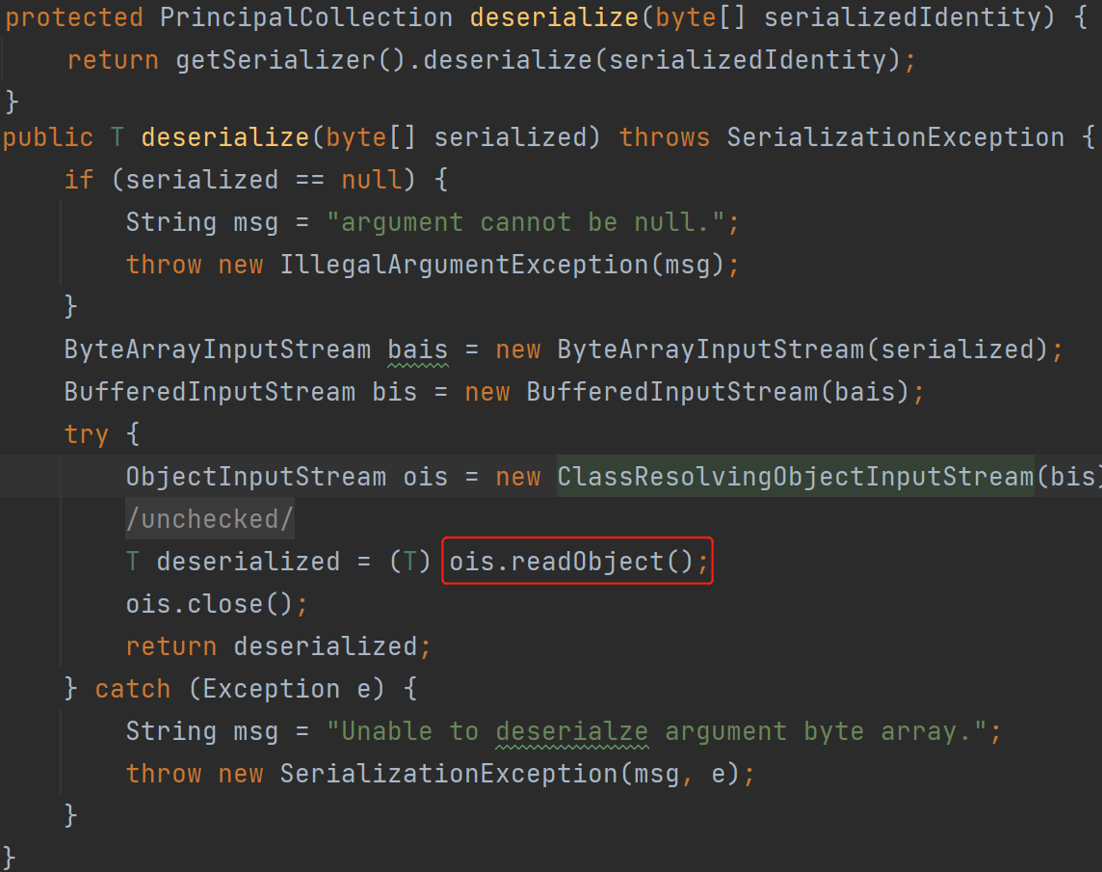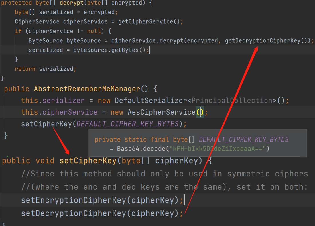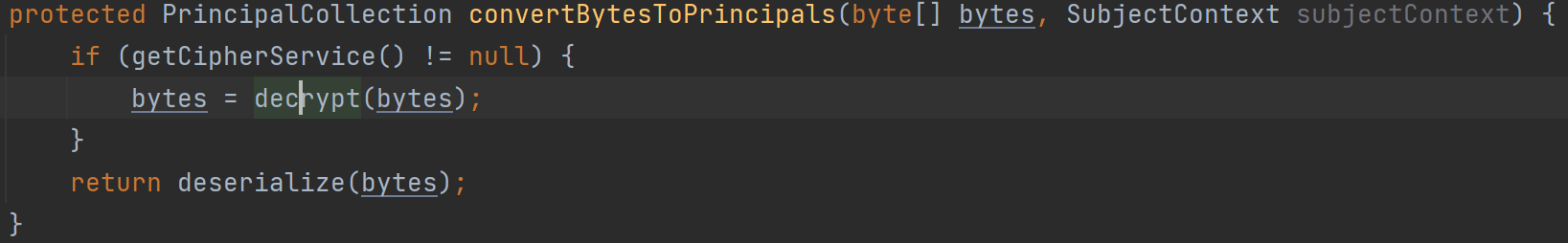 复制protected PrincipalCollection getRememberedIdentity(SubjectContext subjectContext) { RememberMeManager rmm = getRememberMeManager(); if (rmm != null) { try { return rmm.getRememberedPrincipals(subjectContext); } catch (Exception e) { ...... } } return null; } public PrincipalCollection getRememberedPrincipals(SubjectContext subjectContext) { PrincipalCollection principals = null; try { byte[] bytes = getRememberedSerializedIdentity(subjectContext); if (bytes != null && bytes.length > 0) { principals = convertBytesToPrincipals(bytes, subjectContext); } } catch (RuntimeException re) { principals = onRememberedPrincipalFailure(re, subjectContext); } return principals; }1.2.3.4.5.6.7.8.9.10.11.12.13.14.15.16.17.18.19.20.21.22.23.24.其中getRememberedSerializedIdentity方法主要是获取rememberMe的值并进行base64解密,然后convertBytesToPrincipals对base64解密后的值进行AES解密并反序列化。注意这里的异常捕获,先提一下后面再回来分析。我们继续跟进convertBytesToPrincipals方法。
