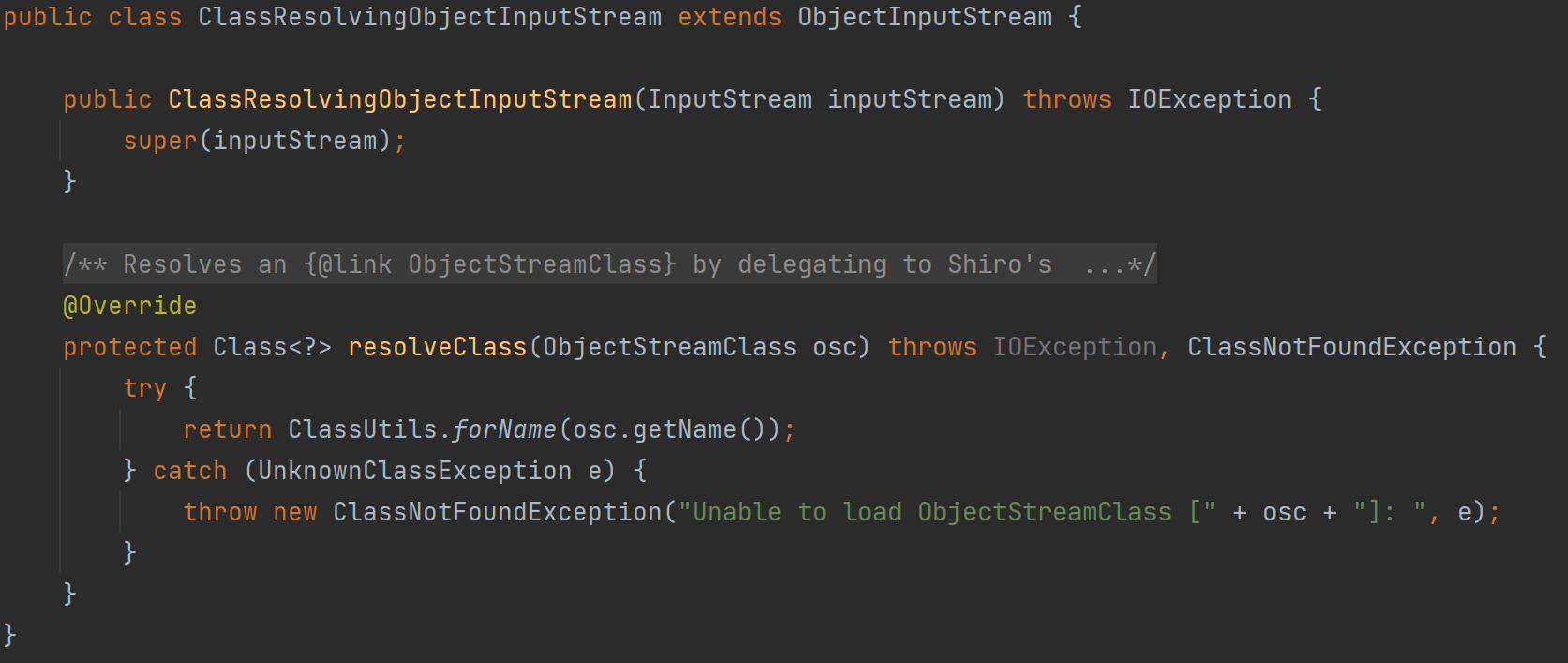 这里调用了readObject方法导致反序列化,注意这里的调用类并不直接是ObjectInputStream对象,而是自定义的一个继承ObjectInputStream的类,并重写了resolveClass方法。
