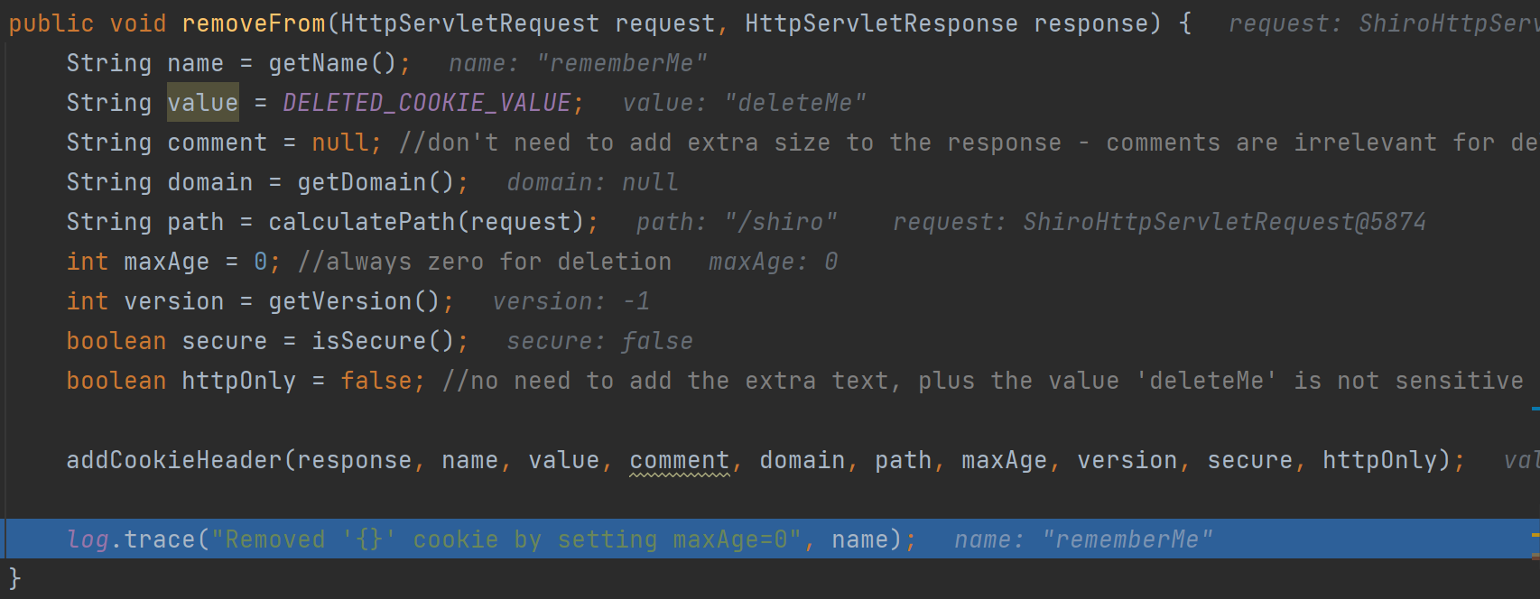 复制protected PrincipalCollection onRememberedPrincipalFailure(RuntimeException e, SubjectContext context) { forgetIdentity(context); throw e; } public void forgetIdentity(SubjectContext subjectContext) { if (WebUtils.isHttp(subjectContext)) { HttpServletRequest request = WebUtils.getHttpRequest(subjectContext); HttpServletResponse response = WebUtils.getHttpResponse(subjectContext); forgetIdentity(request, response); } } private void forgetIdentity(HttpServletRequest request, HttpServletResponse response) { getCookie().removeFrom(request, response); }1.2.3.4.5.6.7.8.9.10.11.12.13.14.从上面的调用链跟踪最后来到SimpleCookie#removeFrom,在这添加了一个cookie为rememberMe=deleteMe,这也是识别shiro框架的特征。同时看整个异常的位置是在base64解密之前,就是从base64解密开始后面的AES解密以及反序列化过程只要抛出了没有被处理的异常最后都会被捕获,设置rememberMe=deleteMe。