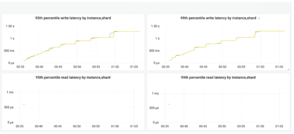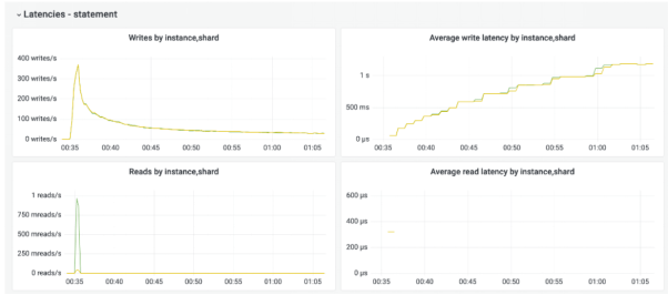 复制CREATE TABLE IF NOT EXISTS {table} ( sensor_id uuid PRIMARY KEY, events map<timestamp, FROZEN<map<text, int>>>, )1.2.3.4.下图的监控快照显示了,该应用同时向集合追加多个项目时发生的情况。