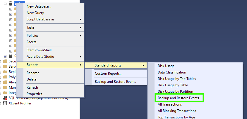 从右键单击菜单中选择“报告” >> “标准报告” >> “备份和恢复事件”。库备