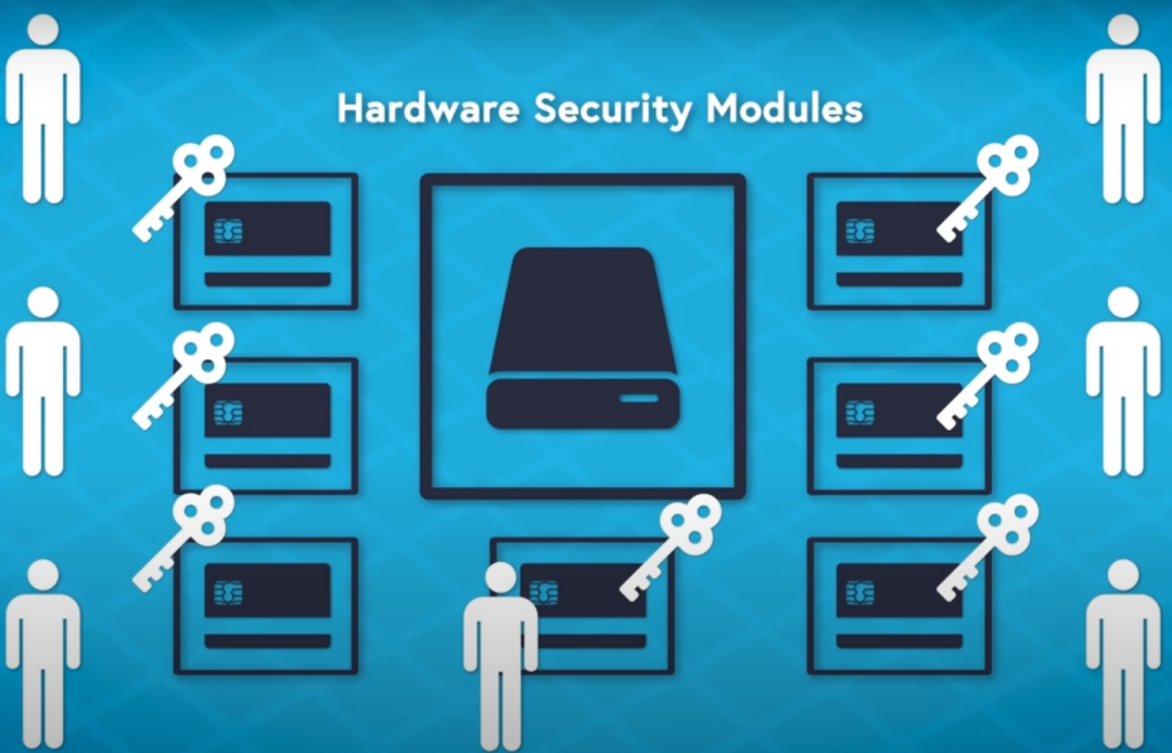 当需要使用ICANN私钥的时候,七个人中的五个需要拿着它们的钥匙,来到保存HSM的地方,取出各自的smart card,然后一起开启HSM。