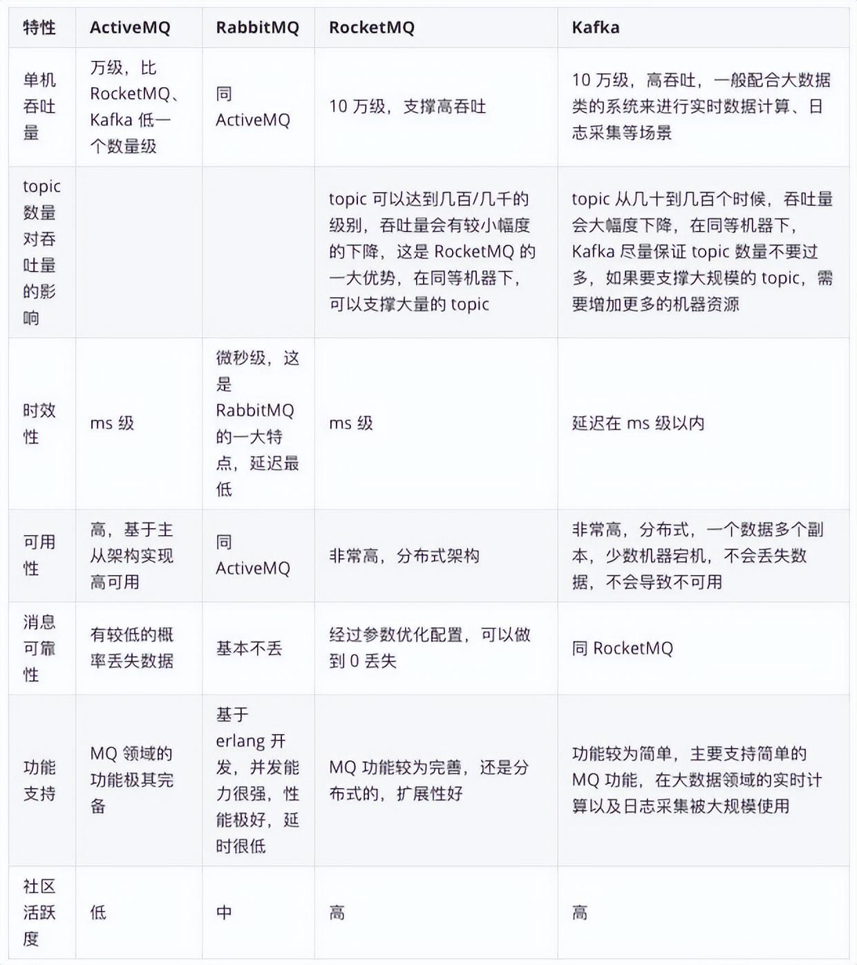 ActiveMQ 的社区算是比较成熟,但是较目前来说,ActiveMQ 的性能比较差,而且版本迭代很慢,不推荐使用。RabbitMQ 在吞吐量方面虽然稍逊于 Kafka、RocketMQ ,由于它基于 Erlang 开发,所以并发能力很强,性能极其好,延时很低,达到微秒级。但是也因为基于 Erlang 开发,所以国内很少有公司有实力做 Erlang 源码级别的研究和定制。如果业务场景对并发量要求不是太高(十万级、百万级),那这几种消息队列中,RabbitMQ 或许是你的首选。RocketMQ 阿里开源,久经双十一考验,可以定制自己公司的 MQ。且支持事务消息,对消息一致性要求比较高的场景优先考虑。Kafka 的特点其实很明显,就是仅仅提供较少的核心功能,但是提供超高的吞吐量,ms 级的延迟,极高的可用性以及可靠性,而且分布式可以任意扩展。同时 Kafka 最好是支撑较少的 topic 数量即可,保证其超高吞吐量。Kafka 唯一的一点劣势是有可能消息重复消费,那么对数据准确性会造成极其轻微的影响,在大数据领域中以及日志采集中,这点轻微影响可以忽略这个特性天然适合大数据实时计算以及日志收集。如果是大数据领域的实时计算、日志采集等场景,用 Kafka 可谓是行业标准。消息队列常见问题