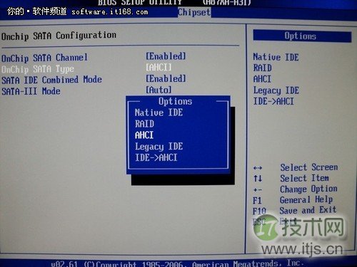 在开机启动时,按下Del 键进入BIOS菜单。我们按左方向键进入“Chinpset”(芯片组)菜单(如图1)。然后,选择“SouthBridge Configuration”(南桥配置)功能菜单进入(如图2)。接着,选择“OnChip SATA Type”(板载SATA类型),将其设置为“AHCI”即可(如图3),按F10保存退出就可以了。