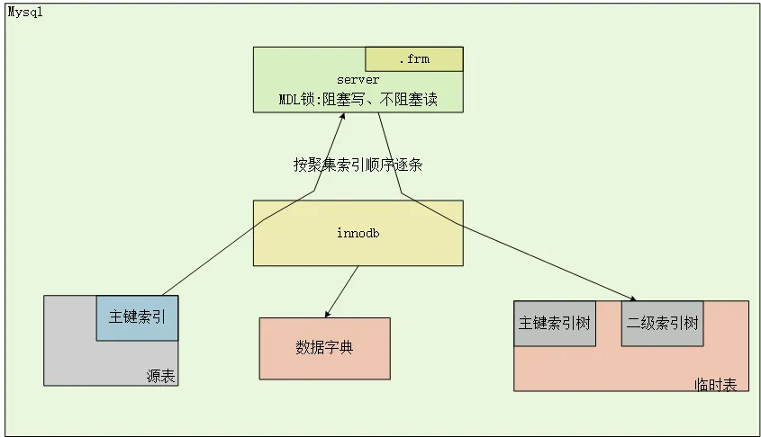 2.1 copyserver层触发创建临时表server层对源表加MDL锁,阻塞DML写、不阻塞DML读server层从源表中逐行读取数据,写入到临时表数据拷贝完成后,升级字典锁,禁止读写删除源表,把临时表重命名为源表MySQL copy方式的DDL变更,数据表的重建(主键、二级索引重建),server层作为中转把从innodb读取数据表,在把数据写到innodb层临时表。简单示意图如下: