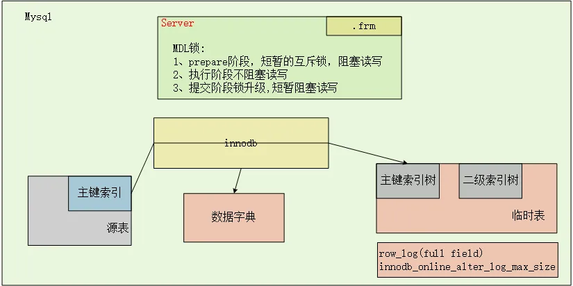 持有EXCLUSIVE-MDL锁,禁止读写根据alter类型,确定执行方式(copy,online-rebuild,online-norebuild)假如是Add Index,则选择online-norebuild更新数据字典的内存对象分配row_log对象记录增量ddl执行阶段 :