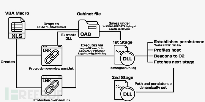 HarfangLab解释:"尽管两起行动存在明显差异...但分析显示诸多共同点:持续使用武器化XLS表格、相似的LNK文件执行流程,云服务器以及跨行动相同的代码片段。"