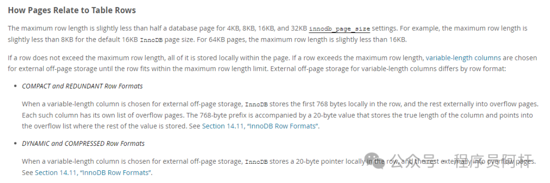 列是否存储在页外取决于页大小和行的总大小。当一行太长时,选择最长的列进行页外存储,直到聚集索引记录适合 B+ 树页(文档里没说具体是多少😅)。小于或等于 40 字节的 TEXT 和 BLOB 直接存储在行内,不会分页。