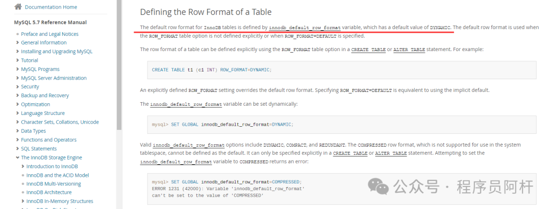 首先,我觉得有必要提一嘴,MySQL5.6的默认行格式为COMPACT(紧凑),5.7及以后的默认行格式为DYNAMIC(动态),不同的行格式存储的方式也是有区别的,还有其他的两种行格式,本文后续的内容主要是基于DYNAMIC(动态)进行讲解的。