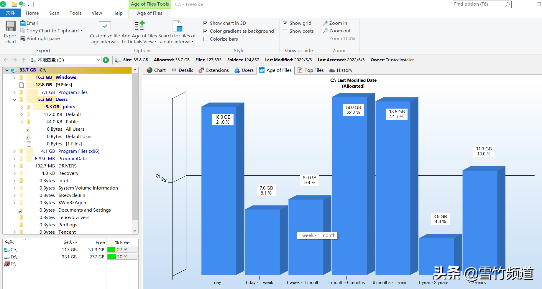 结果可以轻松展示文件和目录的空间占用情况,以及大文件有哪些、按文件的创建时间展示。