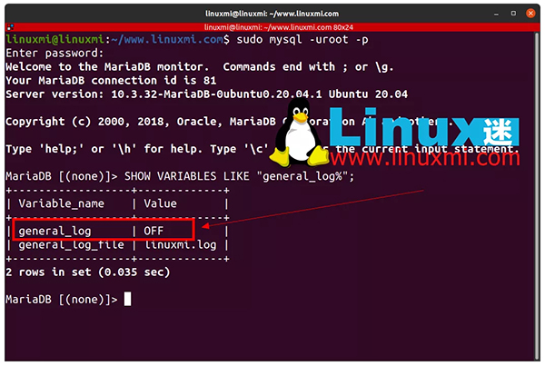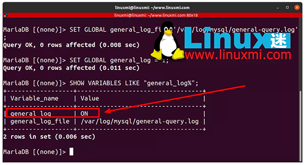 复制SET GLOBAL general_log = 1;1.让我们再次检查一下 MySQL/MariaDB 通用查询日志状态: