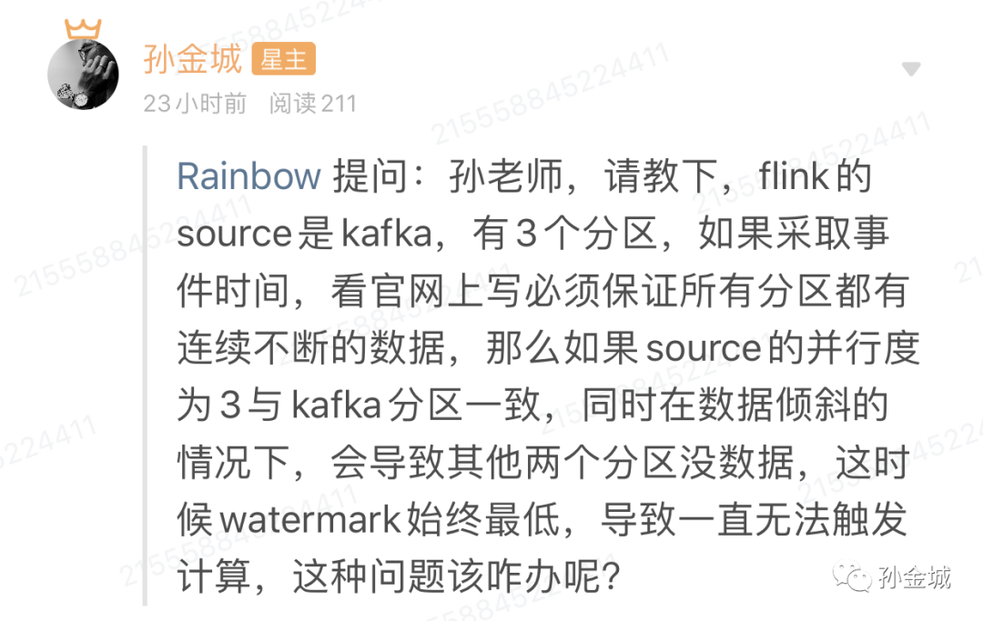 有一种非常..非常...常见的痛苦是Kafka分区数据Skew,由于某一个分区数据缓慢导致整个作业无法事件驱动计算。区数From @孙金城的分放赖知识星球用户,如下: